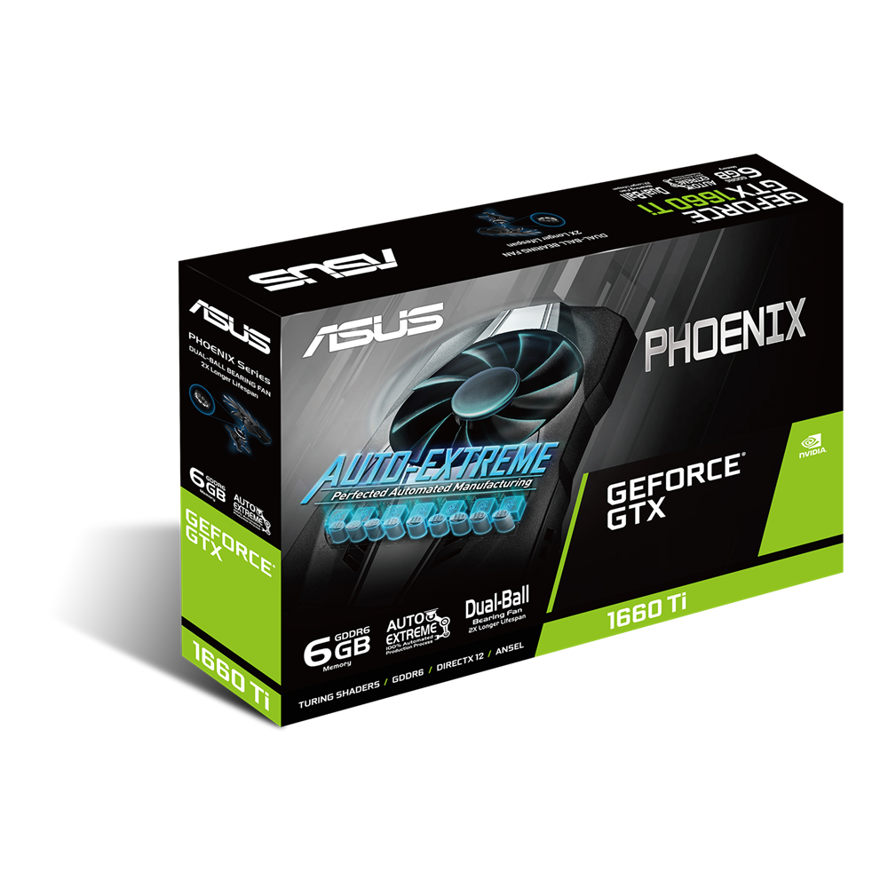 The ASUS Phoenix GeForce® GTX 1660 Ti crams high performance into just 2 slots. Our patented Wing-blade design is coupled with a dual-ball fan bearing to bring high performance and incredible durability. If that doesn't already convince you of the Phoenix's resilience, consider that each card is manufactured using Auto-Extreme Technology, an automated manufacturing process that sets a new standard of quality. If you're looking for a long-lasting companion to power you through years of games to come, look no further than the ASUS Phoenix.